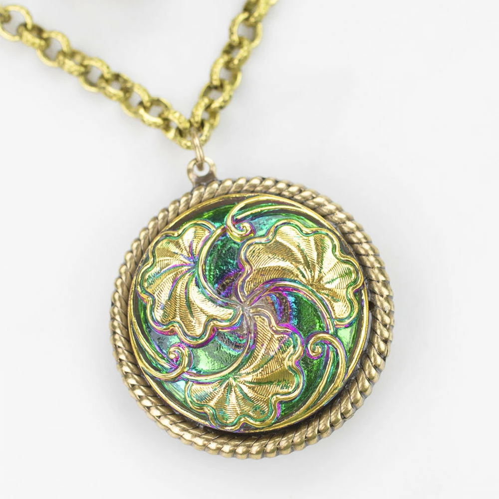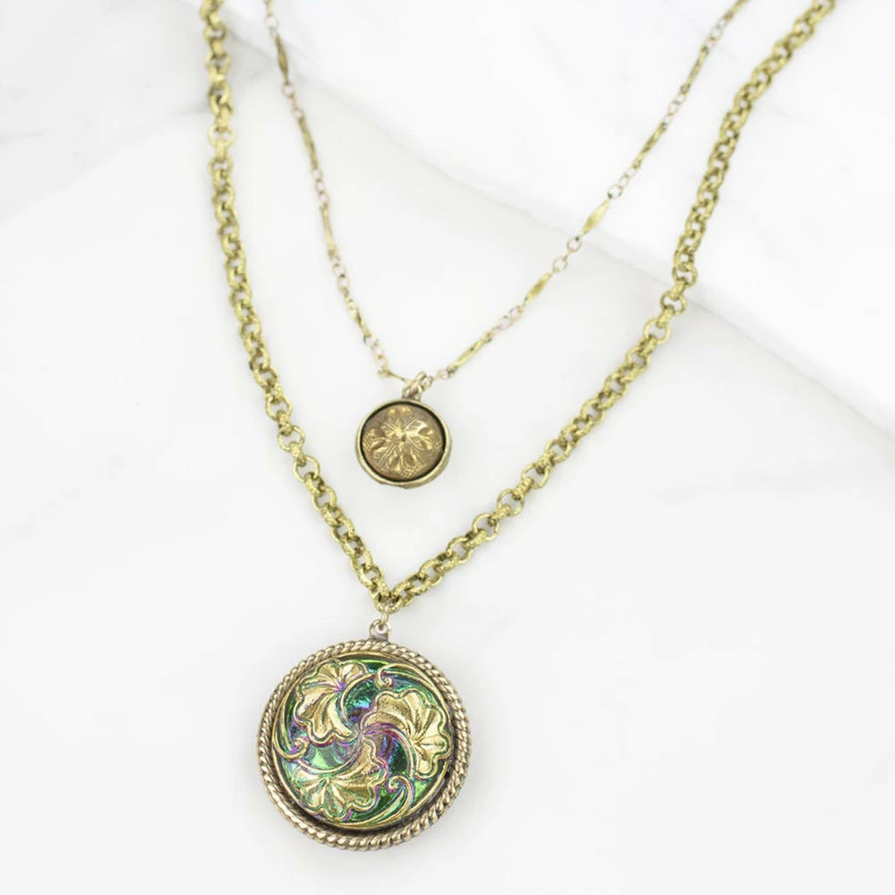 All eyes go first to three delicate, brass ginkgo leaves on a glimmering, iridescent green backgroundβa dazzling button created by master-craftsmen who hand-pressed the glass in antique iron molds in the Czech Republic.Β An ancient species, the ginkgo tree represents endurance, long life, and renewal.Β Suspended from another, inner chain:Β a hammered, antique Victorian brass button, circa 1870 to 1880.Β Ingeniously linked at the back of your neck, the two-in-one piece looks like two separate, exquisite necklaces, perfectly paired.Β Pendants: 1ΒΌ” and Β½” dia; brass, glass.Β Chains: 18″ and 15″ long, with 4″ extender and secure, lobster-claw clasp.Β Antiqued brass.Β