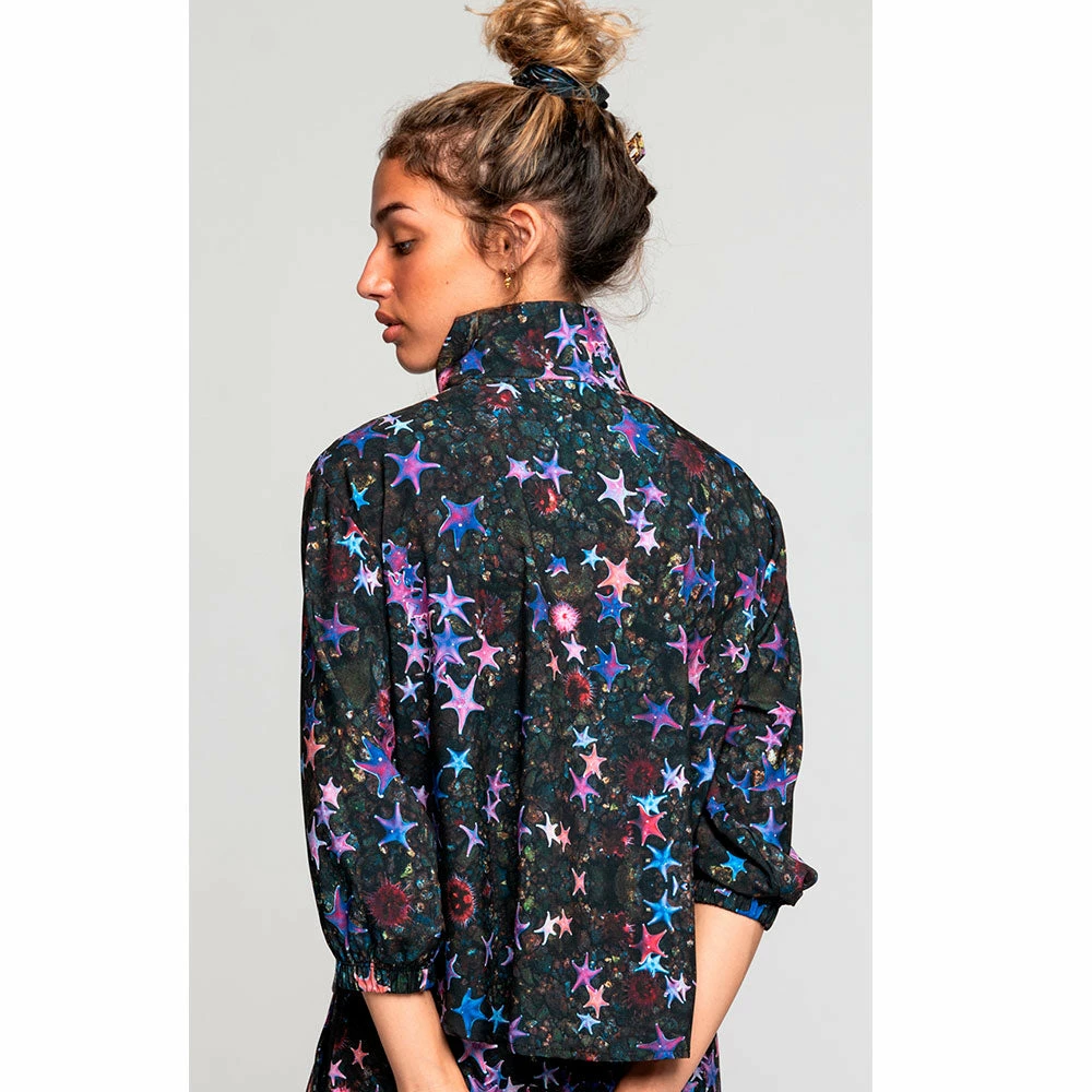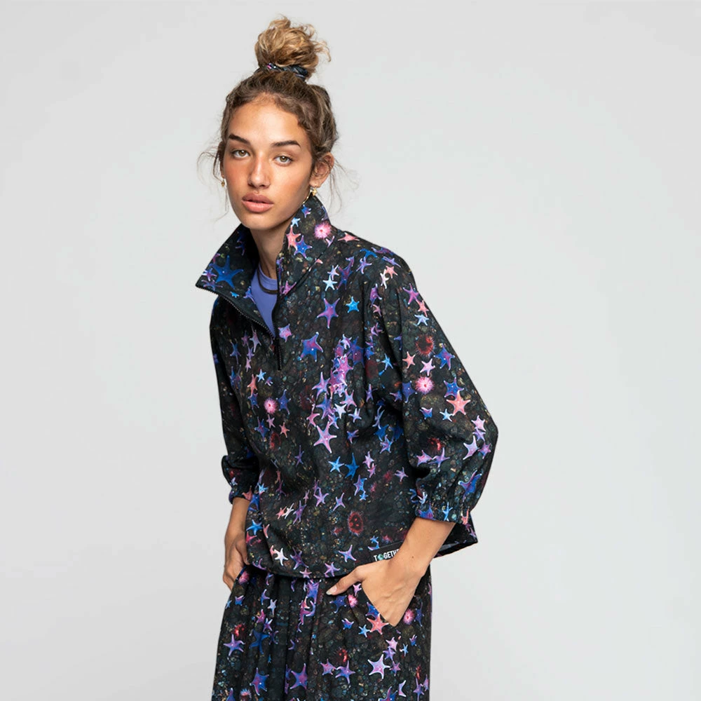 A-Line loose-fit that is longer in the back ΒΎ Sleeves that can scrunch up with elasticized cuffs 8-inch zip-up collar Wear it with our Pleated Skirt or Beach Joggers for a full on head-to toe outfit that will brighten anyoneβs day.
