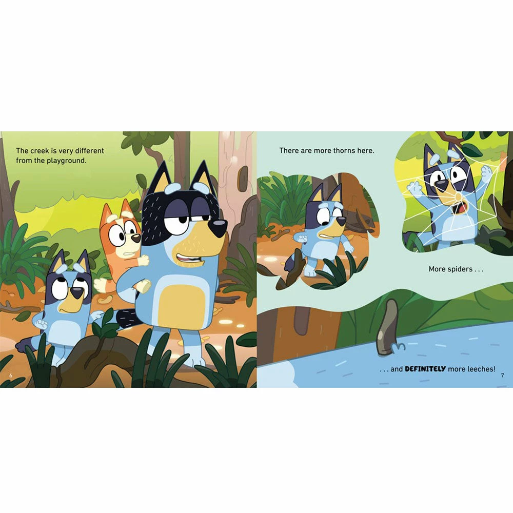 Dad takes Bluey, Bingo, and Mackenzie to the creek after they grow tired of playing at the playground. But Bluey doesnβt like the thorns, or the spiders, or the pointy rocks, orβ¦the leeches! She struggles to find the fun. Can Bluey learn to step out of her comfort zone and try new things? Read along in this 8×8 book to join Blueyβs latest adventure.