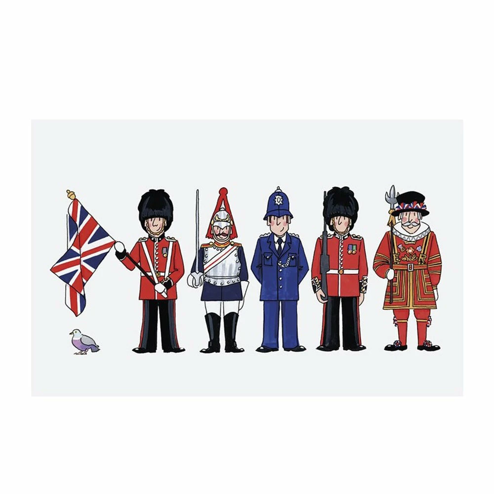 Lighten your day with five upstanding London charactersβfour Kingβs Guards from the infantry, cavalry and Yeomen of the Ward, plus a Bobby.Β Is it our imagination, or are they dipping the flag in salute and smiling as a pigeon walks by?Β Tea Towel: 100% cotton, screen-printed and hand-finished in Lancashire.Β 29″ x 19″; machine wash.Β Β