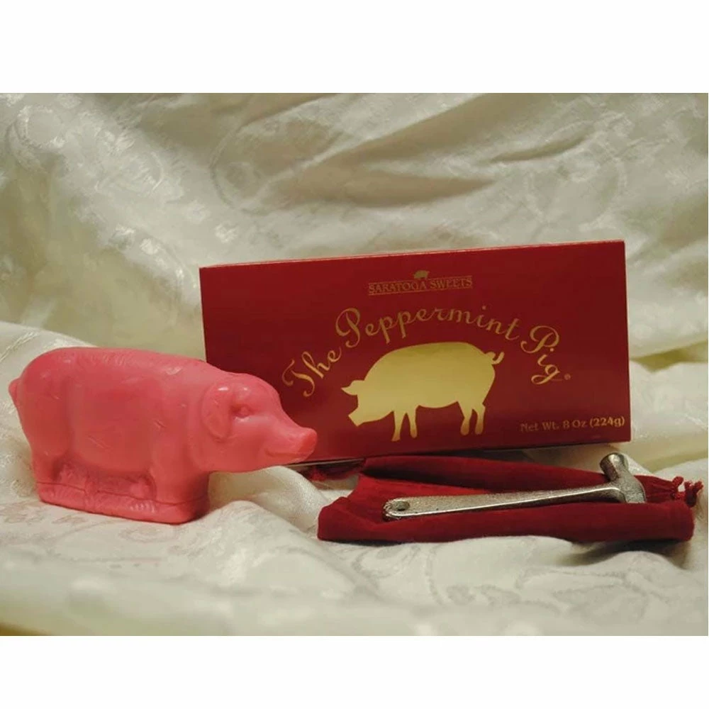In scores of households, the holiday meal isn’t over until everyone enjoys a wee piece of the pig. The peppermint pig, that is. Now your family can share this whimsical-and flavorful- ritual, which dates back to the 1880s. Just tap the plump, pink, little porker with the miniature hammer to break off bits of candy made from a treasured Victorian-era recipe. Both come in a velvet pouch.