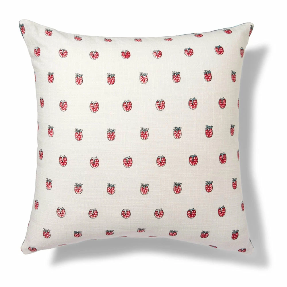 Our square cotton pillow showcases a detail from “Strawberry Thief,” a delightful printed cotton textile.ย