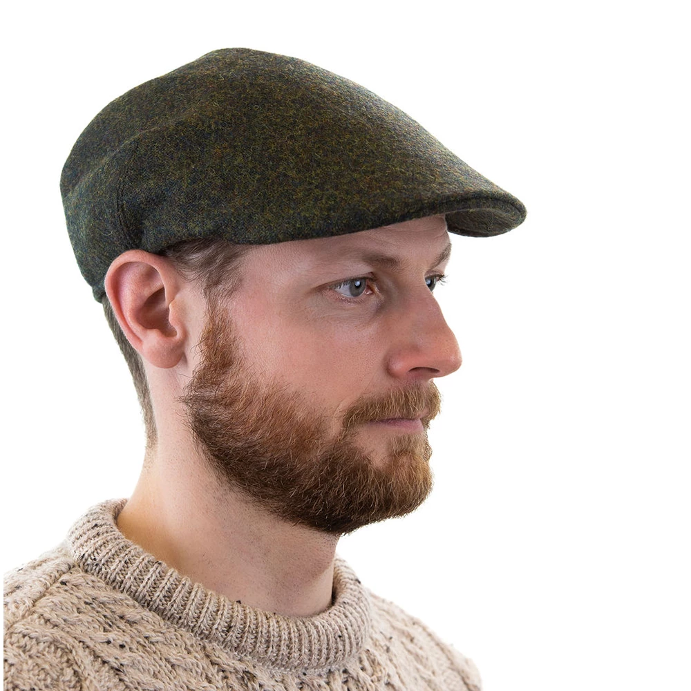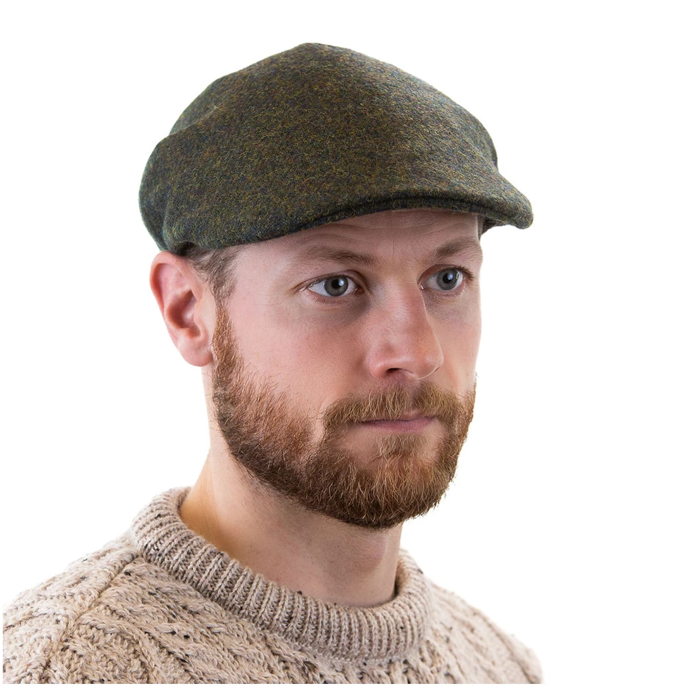 The sleek, curved front of this classic cap complements a manβs face and accents his eyes, while keeping the rain out of them. Exquisitely crafted, 100% wool tweed in green. Menβs sizes S, M, L, XL.